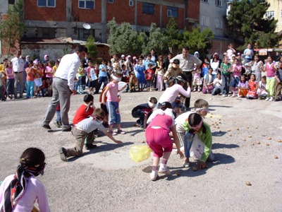 Gözleri bağlı öğrenciler balon patlatmağa çalışıyor