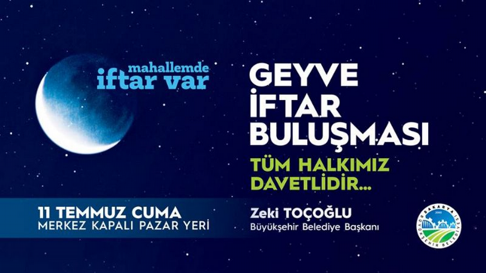 Sakarya Büyükşehir Belediyesi Sosyal Hizmetler Dairesi Başkanlığı tarafından yapılan açıklamada, “11 Temmuz Cuma günü Geyve Buluşması gerçekleştirilecektir. Vatandaşlarımızı bir araya getirecek sofralar Geyve Kapalı Pazar yerinde kurulacak Kur’an-ı Kerim tilavetlerinden sonra, iftarın ardından meddah gösterileri ve orta oyunun gerçekleştirileceği programımıza tüm vatandaşlarımız davetlidir” denildi.