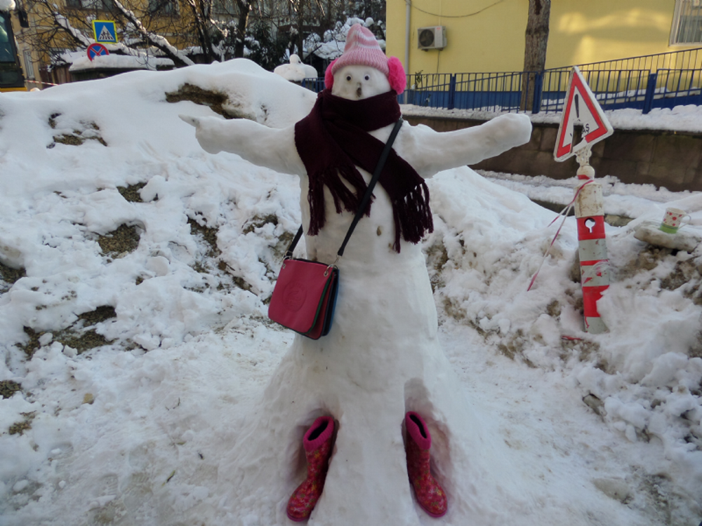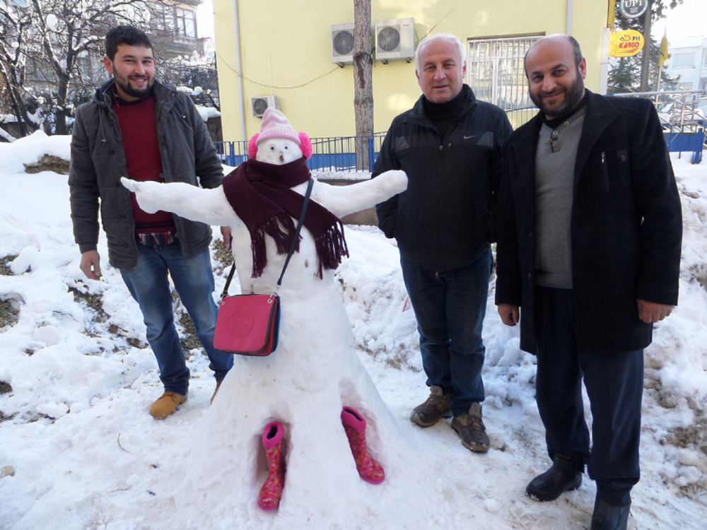 Geyve'nin esnaflarından Mustafa Baydur ve Ramazan Ök: "Kar yağışı nedeniyle esnafın işleri durdu. Bunun için başkaları kardan adam yaparken biz de kardan kız yaptık."dediler