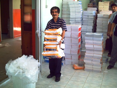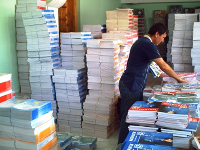 gelen kitaplar sınıflara göre ayrılıp poşetleniyor