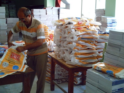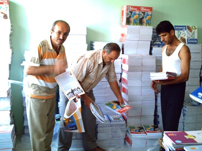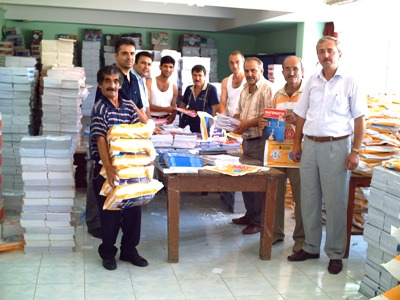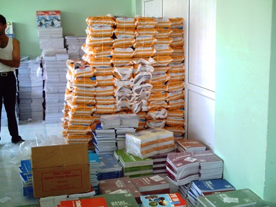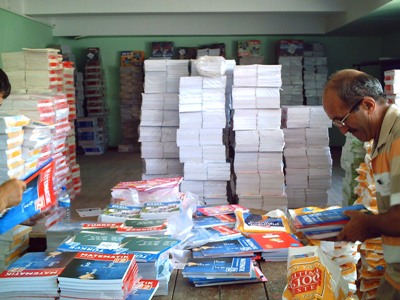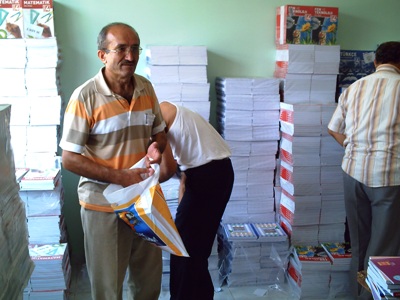 Milli eğitim bakanlığı tarafından, ilk ve orta dereceli okullarda okutulmak üzere gönderilen doksanyedibin (97) adet kitap, sınıflandırılarak poşetleniyor.