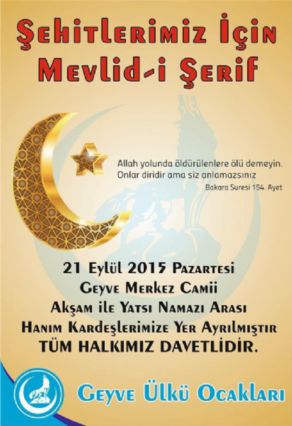 21 Eylül 2015 Pazartesi Geyve Merkez Sinanbey Camii'nde Akşam ile Yatsı namazı arası Şehitlerimiz için Mevlid-i Şerif okunacaktır. Hanım kardeşlerimize yer ayrılmıştır.