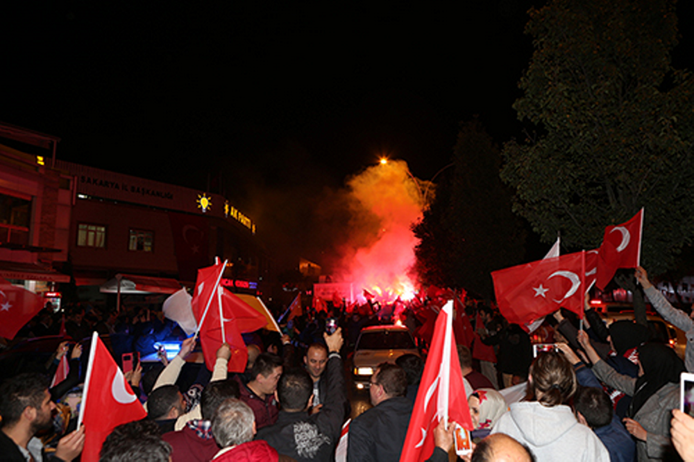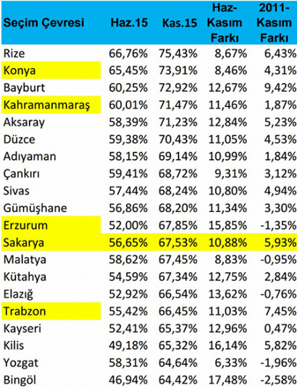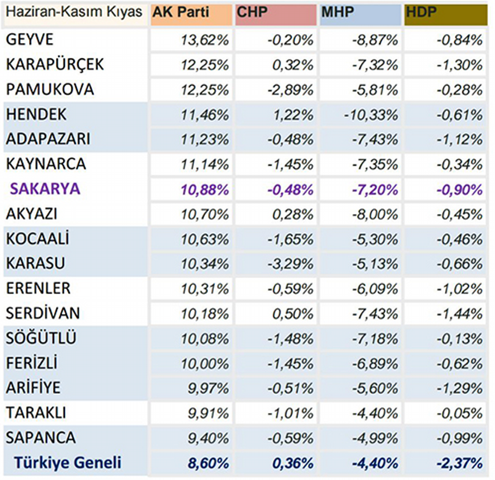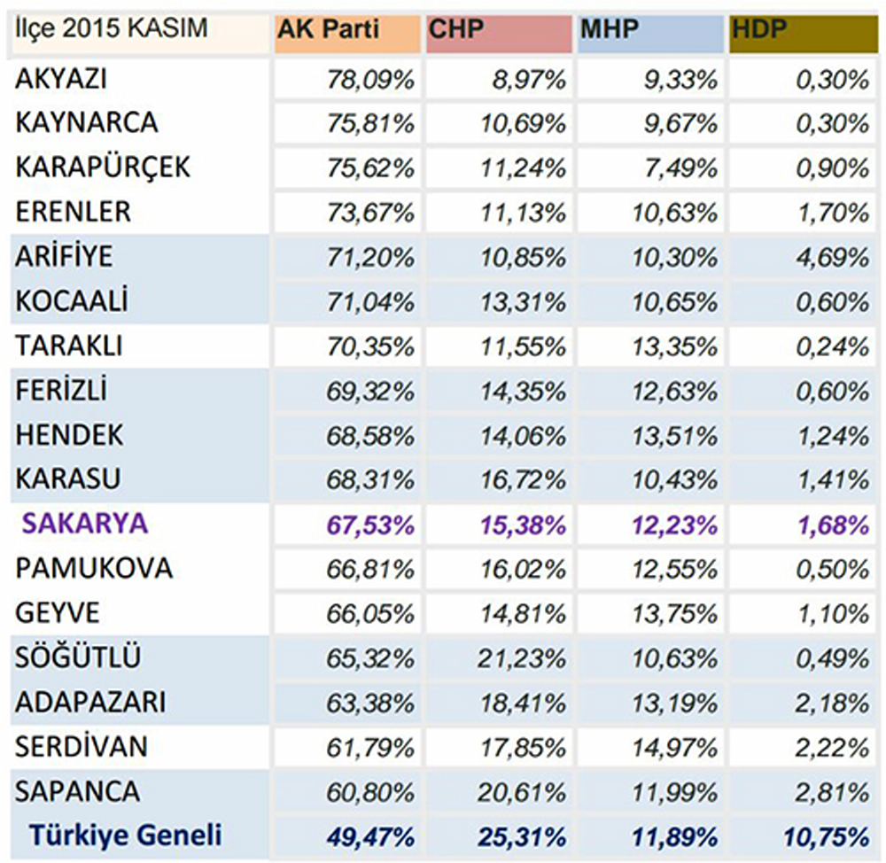 Sakarya'da İlçelerin Oy Oranı 7 Haziran’da yapılan milletvekilliği genel seçimlerinde tek başına iktidar olacak milletvekili sayısına ulaşamayan AK Parti, 1 Kasım seçimlerinde oylarını 9 puan arttırarak yüzde 49.8 ve 317 milletvekili ile yine tek başına iktidar oldu. Ali ARICI 4.11.2015 - 05:10:57 #