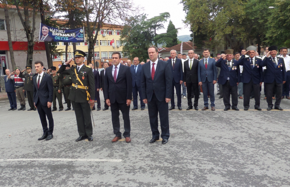 Geyve Cumhuriyet Meydanında yapılan törene; ilçe kaymakamı İlyas Memiş, Garnizon komutanı Personel Yüzbaşı Taner Çolak, belediye başkanı Murat Kaya, Cumhuriyet Savcısı Fatih Çıtak, Jandarma Assubay Kıdemli Başçavuş Seydi Vakkas Aytekin, Askerler, Emniyet Amiri Uğur Duman, Meslek Yüksek Okulu Müdürü Yrd.Doç.Dr. Nermin Akyel, ilçe Milli Eğitim Müdürü Mehmet Doğan, daire amirleri, okul idarecileri, öğrenciler ve vatandaşlar katıldı.