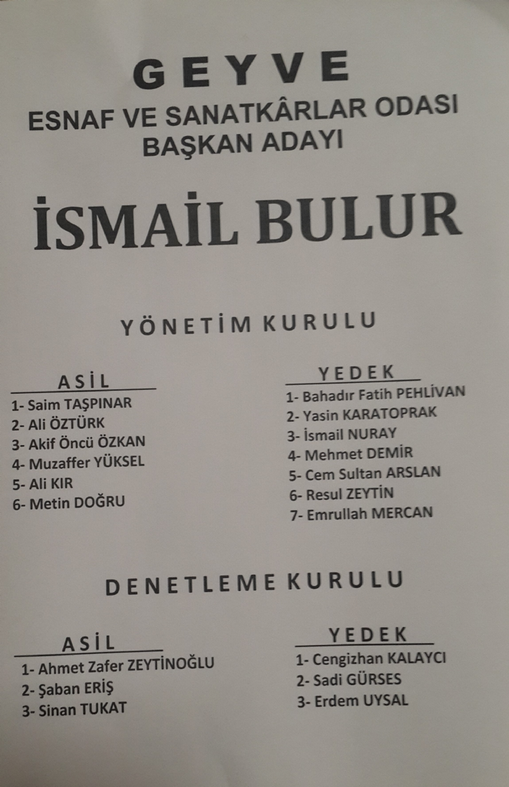 İlçe Kaymakamı İlyas Memiş’e teşekkür ettiğini belirten başkan Bulur:” Aylık olarak toplandığımız guvenlik toplantısında ilçemizdeki sorunları tek tek dile getiriyoruz. Geyve’de kurulan kermesler sorun olusturuyordu. Kaymakımız kermesleri bir düzene koydu. İlçemizde kapaslık yapan arakdaslarımızın sorunları var. Mezbahane nin Sakarya il merkezinde olması kasap arakadaslarımızı sıkıntıya sokuyor. Bu sorunu çözmek için Büyük Şehir Belediye başkanı Zeki Toçoğlu’na ilettik. Butik kesim hane için Geyve’ye kurulacagı mujdesini bize verdi. Geyve’de bulunan mezbahene yi ne yazıkki belediye başkanı kullanım için vermedi. Böyle olunca mezbahene de kurulamadı. Büyükşehir belediye Başkanına hangi sorunumuzu söylediysek bizlere hep yardımcı oldu. Kendisine buradan teşekkürlerimi sunuyorum” dedi.