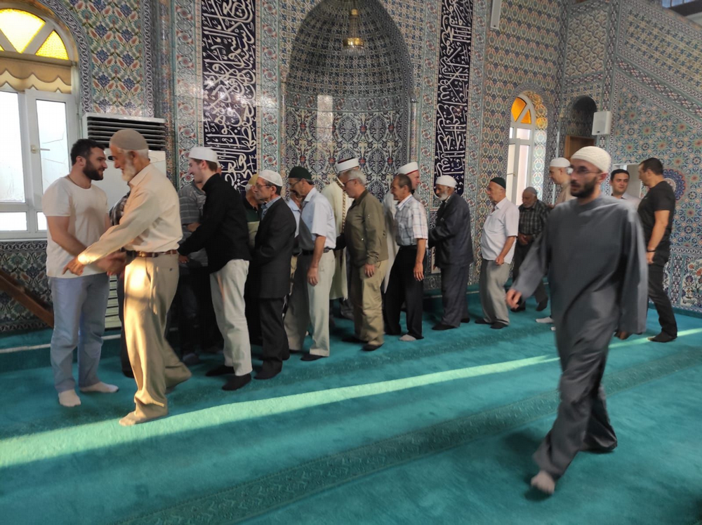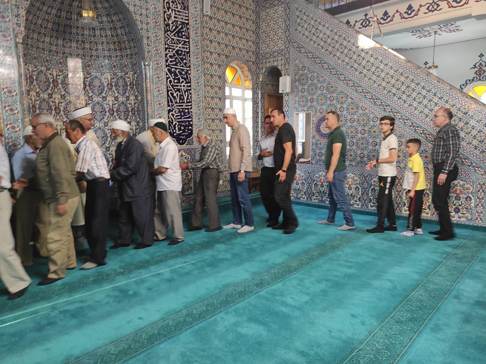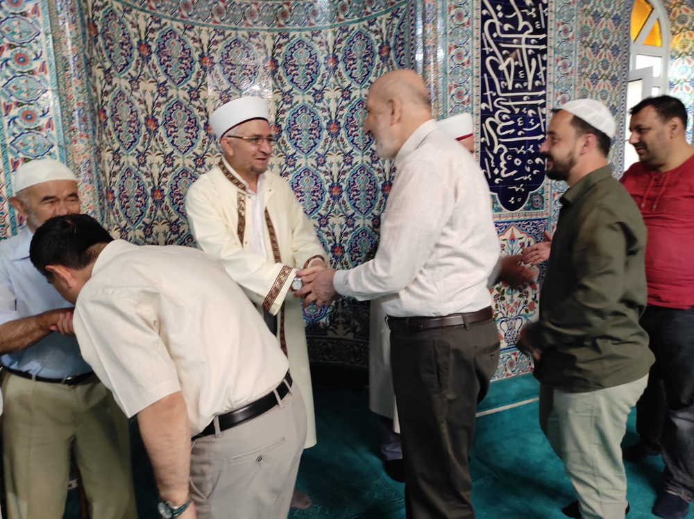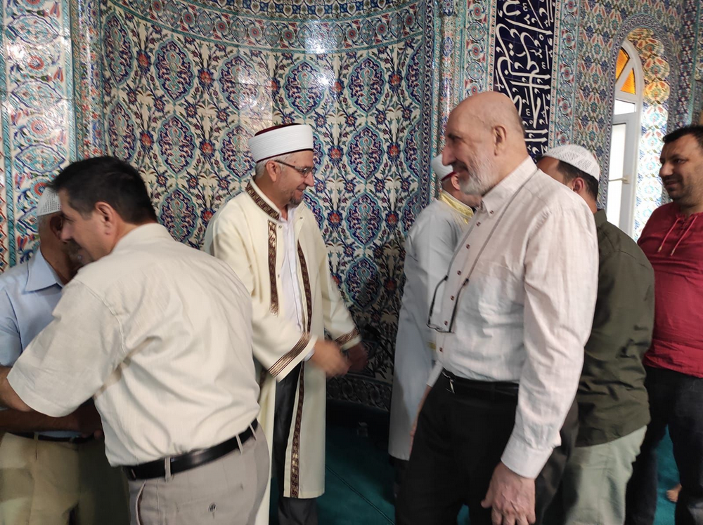 Namaz sonrası cemaat cami içinde bayramlaştı ve Geyve'de doktor olan oğlunu ziyarete gelen Yazar Abdurrahman Dilipak ile sohbet ettiler.