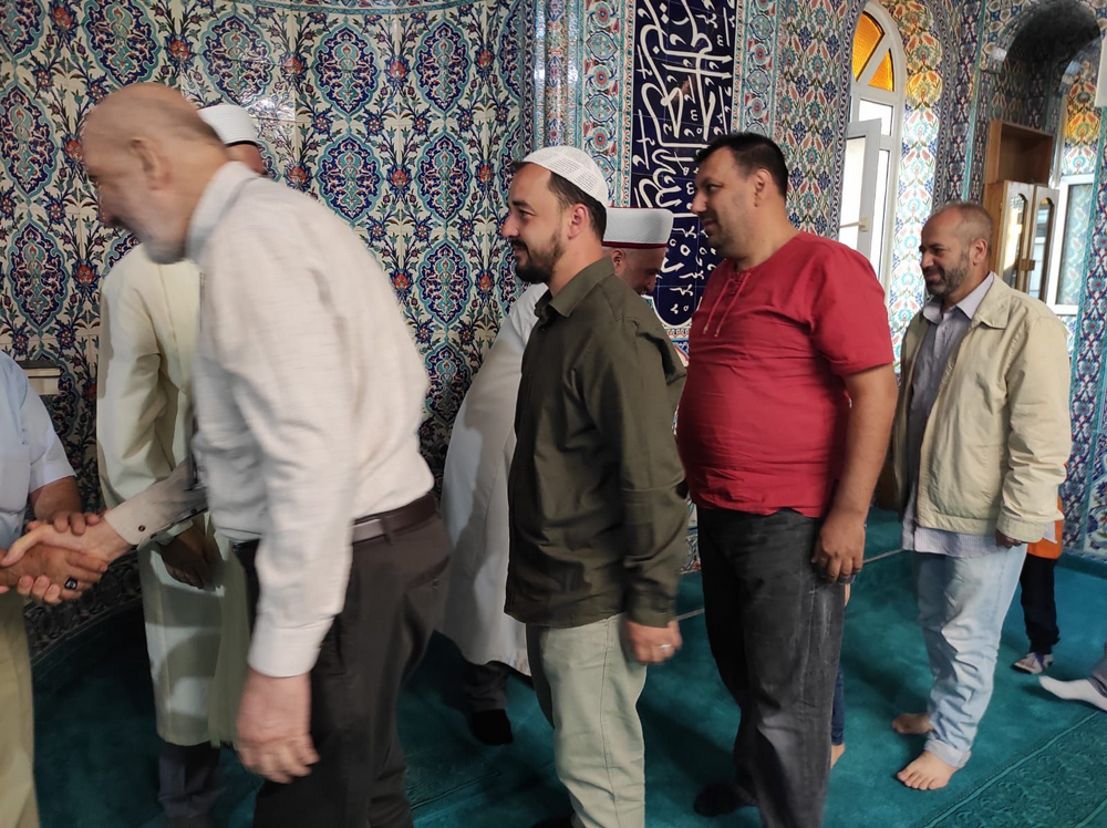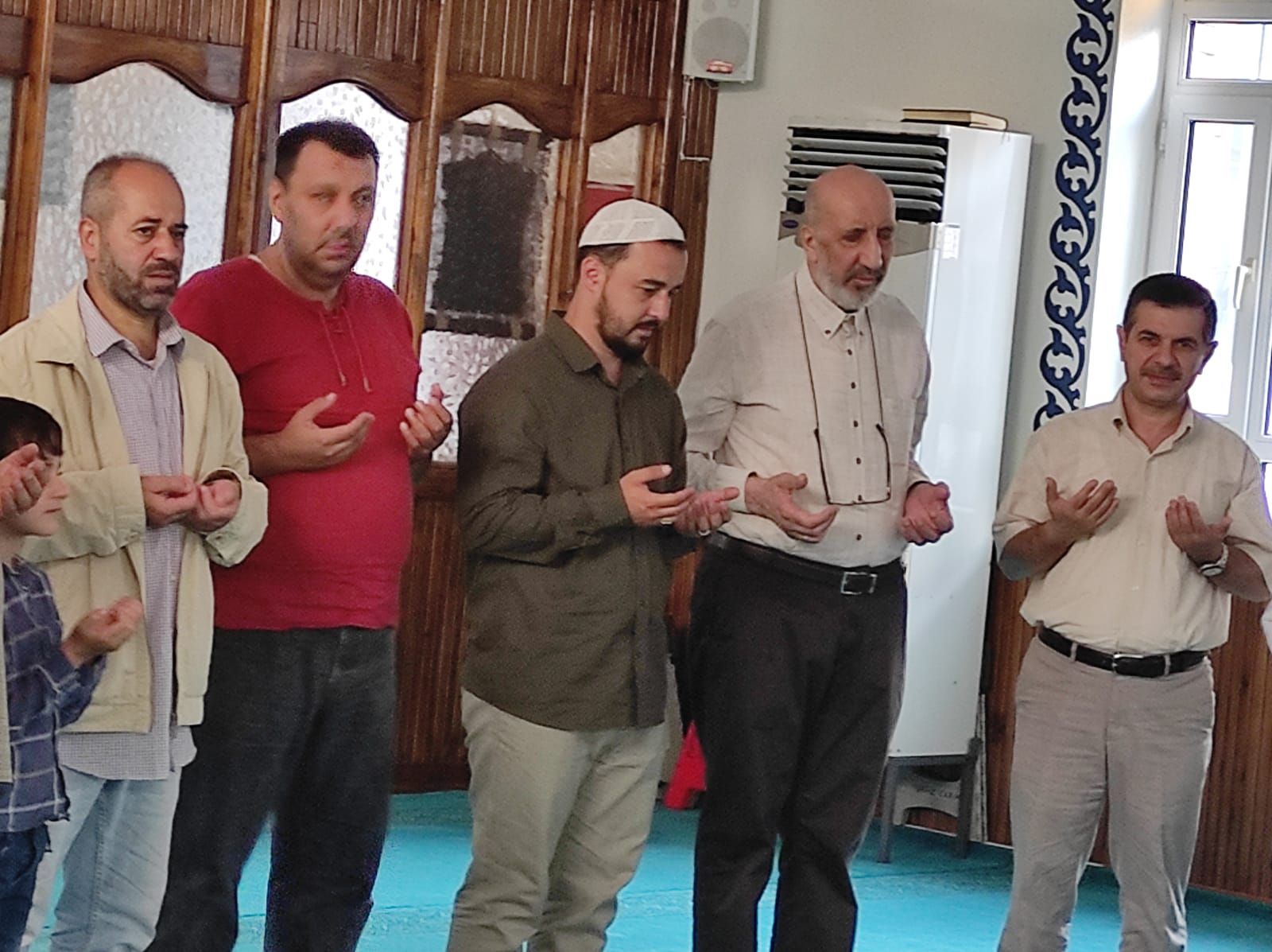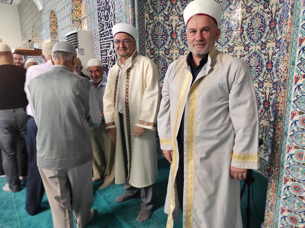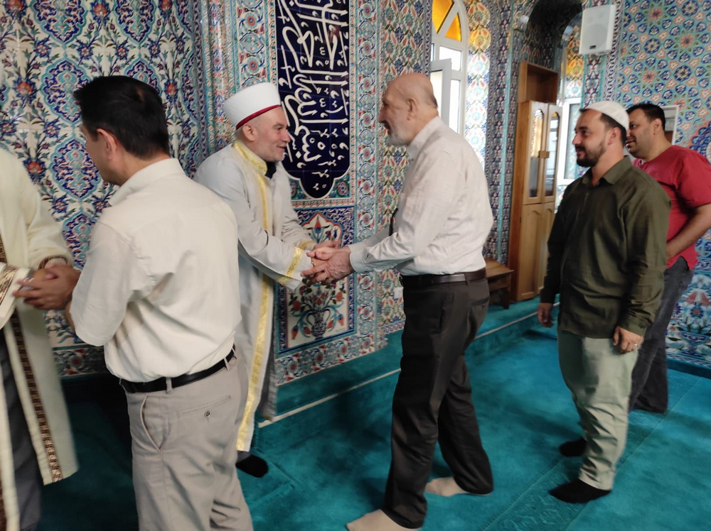 Namaz sonrası cemaat cami içinde bayramlaştı ve Geyve'de doktor olan oğlunu ziyarete gelen Yazar Abdurrahman Dilipak ile sohbet ettiler.
