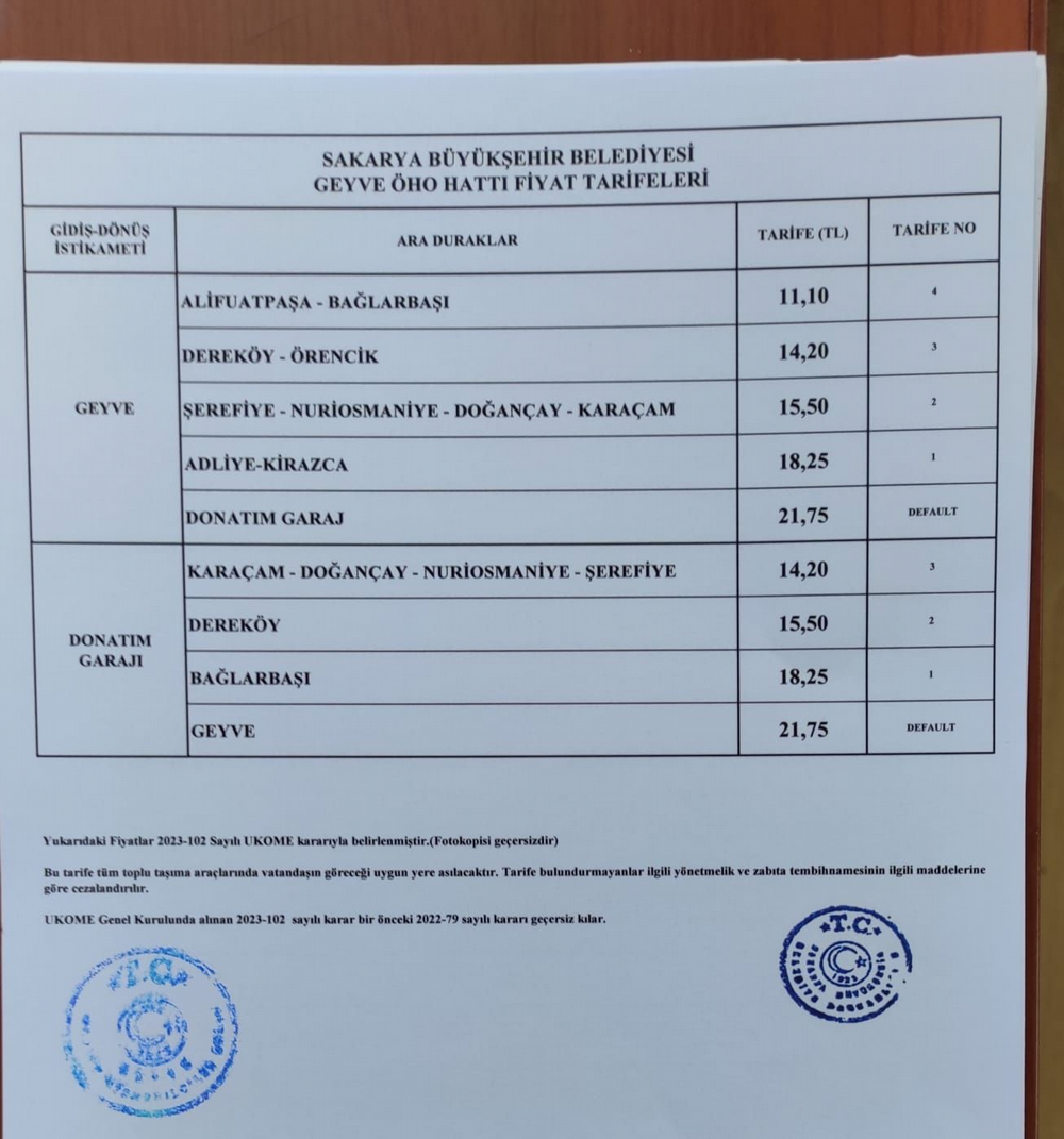 GEYVE'de ULAŞIMA ZAM GELDİ . Mehmet AYDOĞAN 8.02.2023 - 18:20:05 GEYVE'de ULAŞIMA ZAM GELDİ Geyve -Adapazarı arasında yolcu taşıyan Sakarya Büyükşehir Belediyesine UKOME'ye bağlı otobüsçüler (GEYVEKOOP), ulaşıma zam yaptı. Yeni tarifeye göre Geyve- Adapazarı yol ücreti 21,75 liradır. #geyve #otobus #zam #
