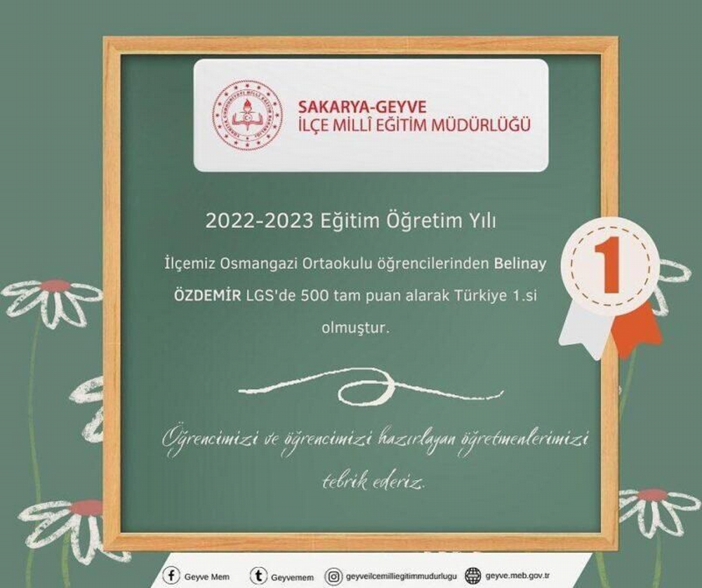 “İlçemiz Osmangazi Ortaokulu öğrencilerinden Belinay Özdemir LGS’de 500 tam puan alarak Türkiye birincisi olmuştur. Öğrencimizi ve öğrencimizi sınava hazırlayan öğretmenlerimizi tebrik ederiz” dedi.