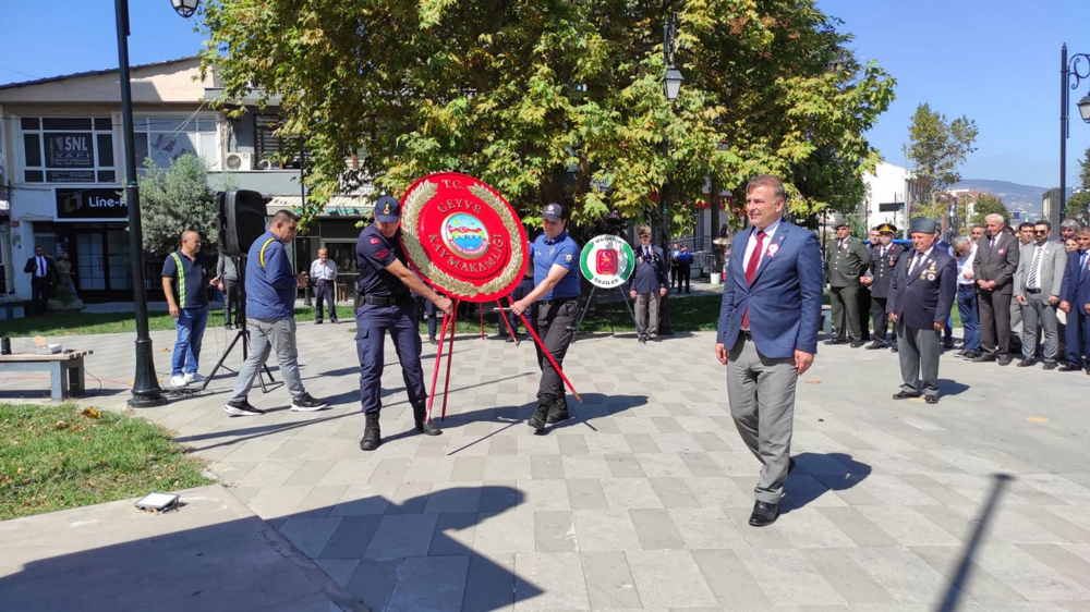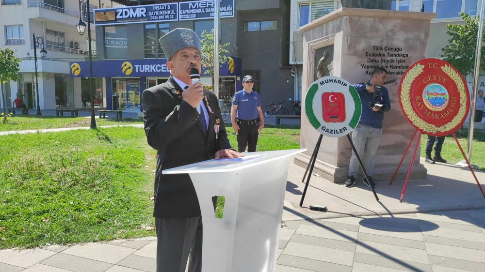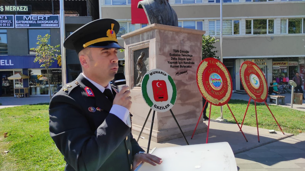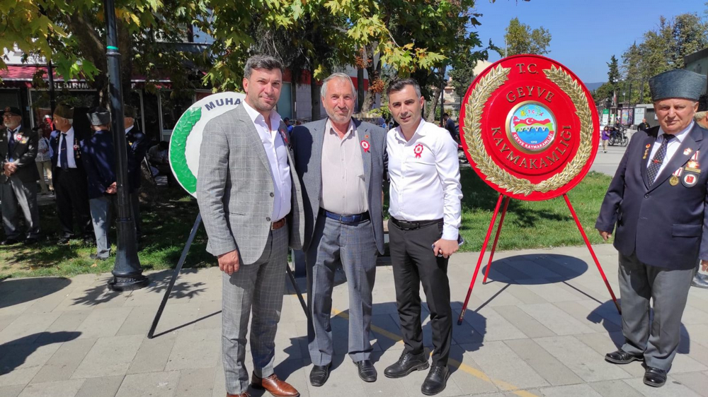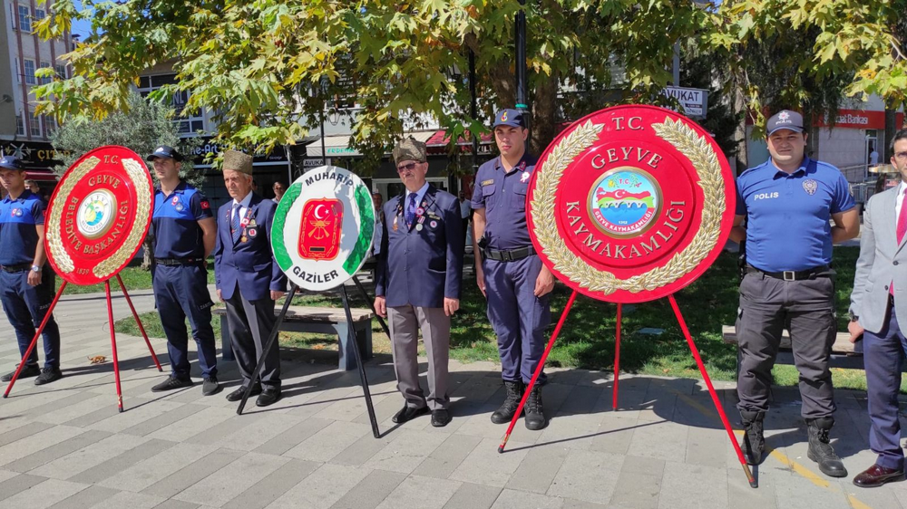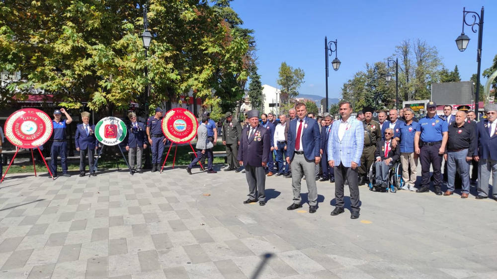 Geyve Cumhuriye,t Meydanında düzenlenen törende; ilçe kaymakamı Murat Güven, belediye başkanı Metin Atalay ve Gaziler Derneği başkanı Ekrem Uysal Atatürk anıtına çelen sundular.