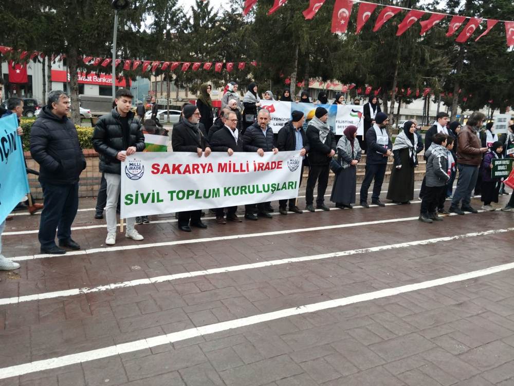 Adapazarı AKM önünde Sakarya Milli İrade Sivil Toplum Kuruluşları adına Cihannüma Dayanışma ve İşbirliği Derneği, Filistin ve Gazze'ye destek açıklaması yaptı.
