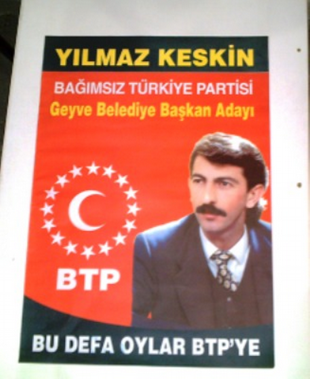 BTP Geyve belediye başkan adayı sanatçı Yılmaz Keskin; "Geyveli halkımızın oyları ile başkanlığa talibim. takdir sizlerindir."dedi.