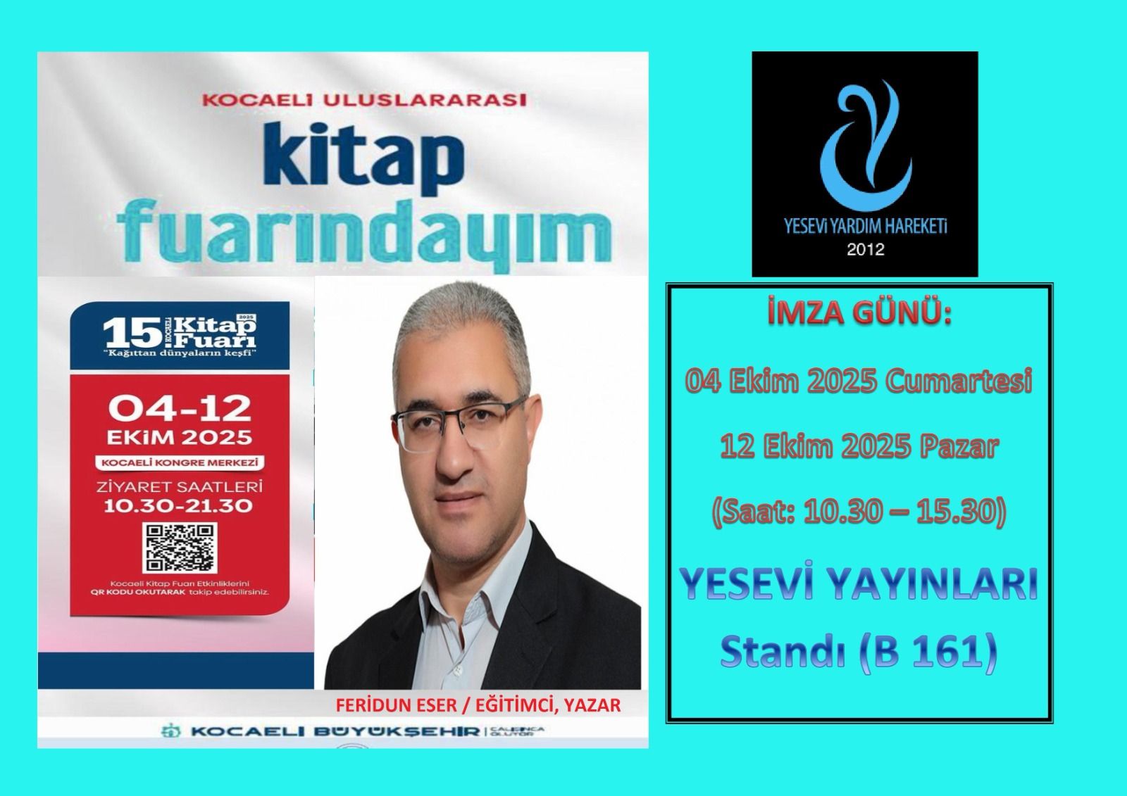 Feridun Eser, ‘‘İlk defa geçen sene katıldığım Kocaeli Kitap Fuarına bu sene tekrar davet edildim. Bu, memnuniyet verici bir etkinlik. Fuarın ilk günü 04 Ekim ve son günü 12 Ekim’de 2 ayrı gün saat 11.00 – 16.00 arası B 161 nolu Yesevi Yayınları Standında olacağım. Ziyaretçi ve okurlarla sohbet edip kitaplarımızı imzalayacağız’’ dedi.
