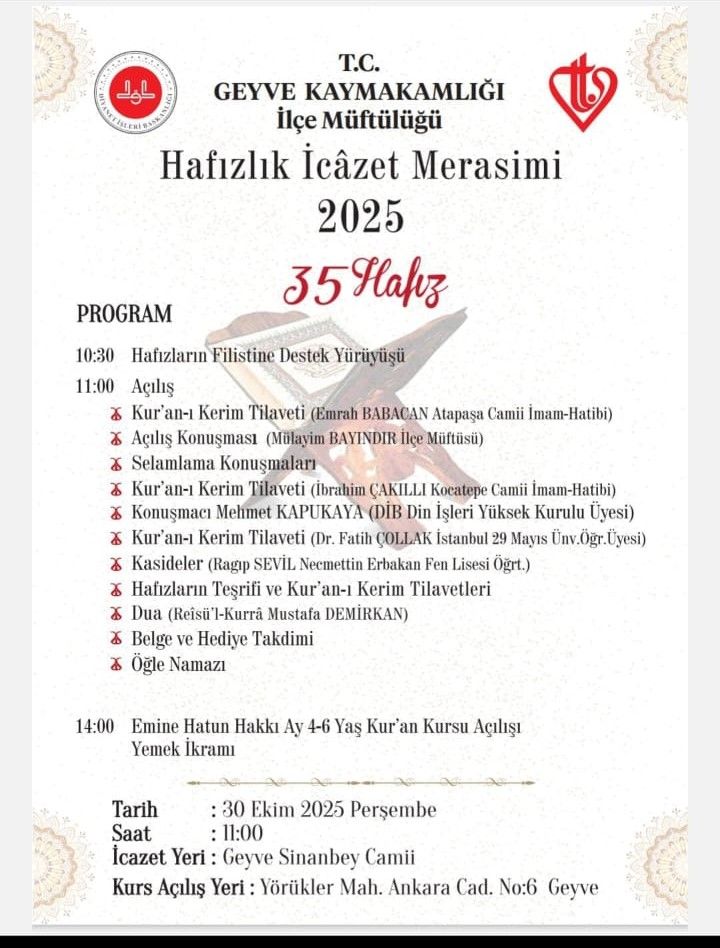 Geyve Müftülüğü tarafından organize edilen ve 35 hafızın taçlandırılacağı "Hafızlık İcazet Merasimi", 30 Ekim 2025 Perşembe günü saat 11.00'de Merkez Sinan Bey Camii'nde gerçekleştirilecektir. Geyve Müftüsü Mülayim Bayındır, camide yaptığı vaazda tüm ilçe halkını bu anlamlı programa davet etti. Geyve Diriliş Kur'an Kursu'nda eğitimlerini tamamlayan 35 öğrenci, bu özel günde icazetlerini alacak.