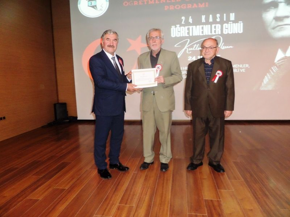 AK Parti ilçe başkanı Hasan Çetinkaya, tüm öğretmenler adına İlçe Milli Eğitim Müdürü Aziz Demir ve Ahmet Özdemir’e çiçek takdim etti.