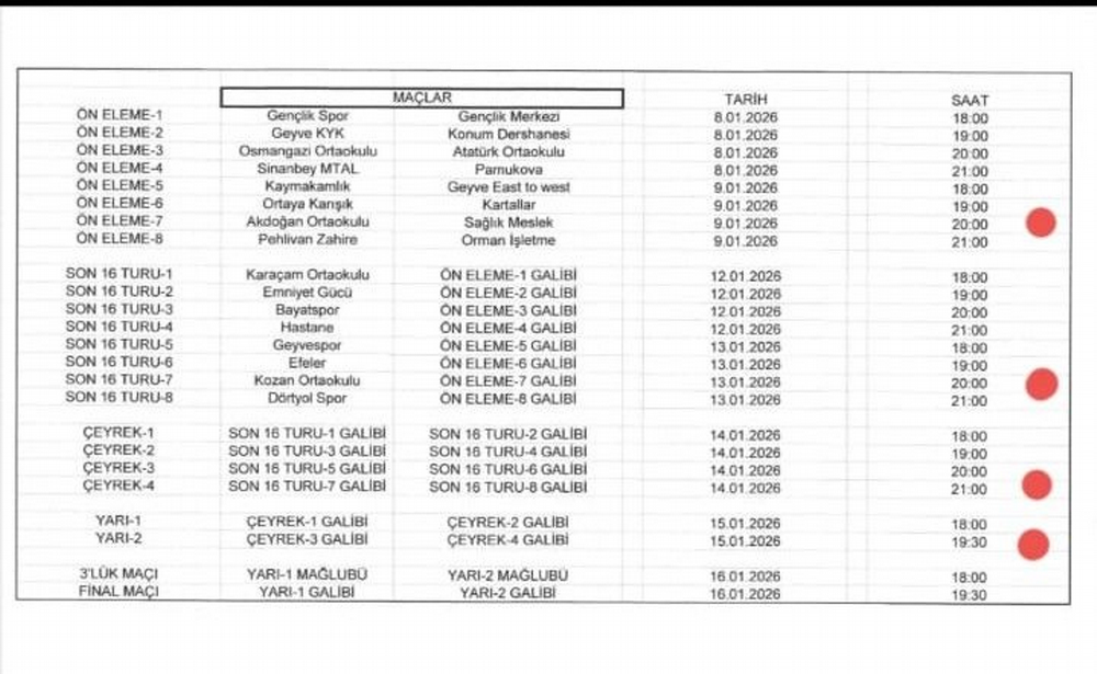 Turnuvaya katılan takımlar: Geyve Spor, Geyve KYK, Osmangazi Ortaokulu, Sinan Bey MTAL, Ortaya Karışık, Akdoğan Ortaokulu, Pehlivan Zahire, Karaçam Ortaokulu, Emniyet Gücü, Bayatspor, Hastane, Efeler, Kozan Ortaokulu, Dörtyol Spor, Gençlik Merkezi, Konum Dersanesi, Atatürk Ortaokulu, Pamukova, Geyve East to west, Kartallar, Sağlık Meslek ve Orman İşletme.