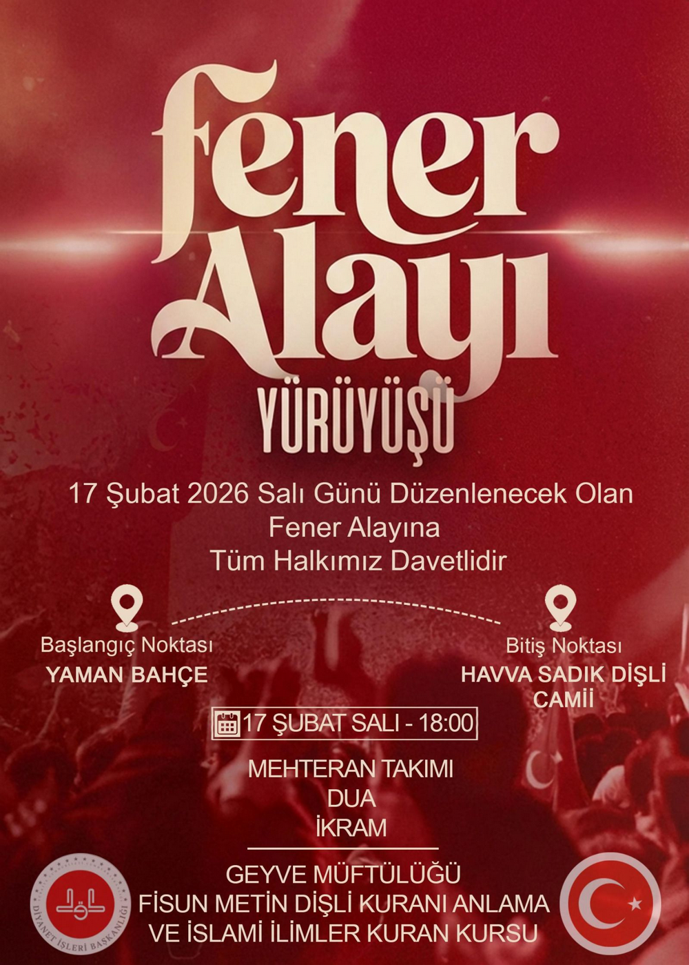 Geyve ilçesi, önemli bir dini ve kültürel etkinliğe ev sahipliği yapmaya hazırlanıyor. Geyve Müftülüğü ile Fisun Metin Dişli Kur’anı Anlama ve İslami İlimler Kur’an Kursu'nun ortaklaşa düzenlediği "Fener Alayı Yürüyüşü", bölge halkını bir araya getirecek.