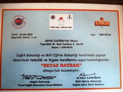 Sakarya İl'indeki okullar arasında Sağlık Bakanlığı ve Milli Eğitim Bakanlığı tarafından yapılan denetimlerde temiz ve hijyen kurallarına uygun bulunan ve ''BEYAZ BAYRAK'' ile ödüllendirilen yedi okuldan biri olan Geyve İlköğretim Okulu kazandığı BEYAZ BAYRAĞI yapılan bir törenle göndere çekti.Okul Müdürü Mehmet Doğan yaptığı konuşmada;öğrenci ve öğretmenlere gösterdikleri duyarlılık ve kararlılıktan dolayı teşekkür etti. Doğan, "Bu tavrımızla kazandığımız bayrağı onurla göndere çekiyoruz. Bu tutarlı davranışların devam etmesini istiyorum" dedi.