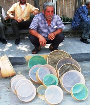 Kendi yaptığını söylediği,ipek elekleri,çirişli deriden yapılan kalburları,elekleri satarak geçimini sağlıyor.