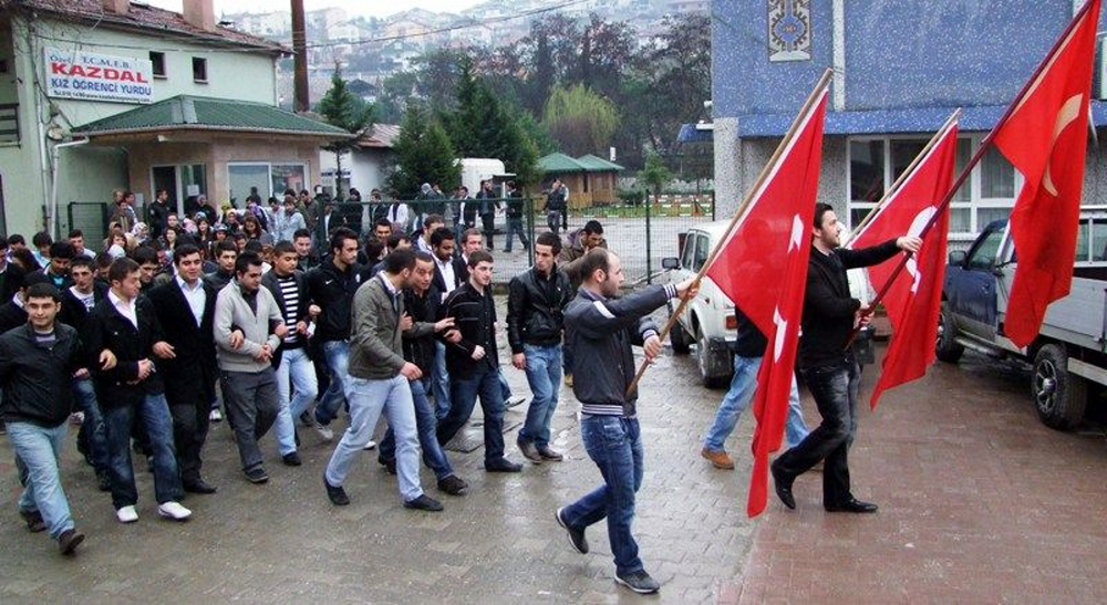 Öğrenciler yürüyüş sırasında: “Şehitler Ölmez, Vatan Bölünmez” “Tekbir – Allah’u Ekber” “Aponun P..leri, Yıldıramaz Bizleri” sloganlarını sık sık tekrarladı.