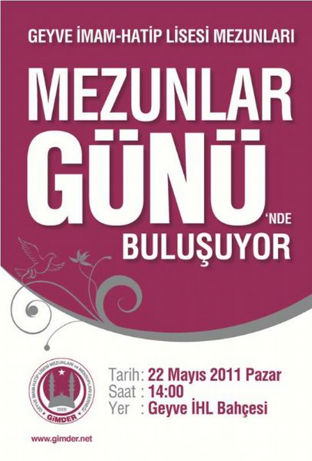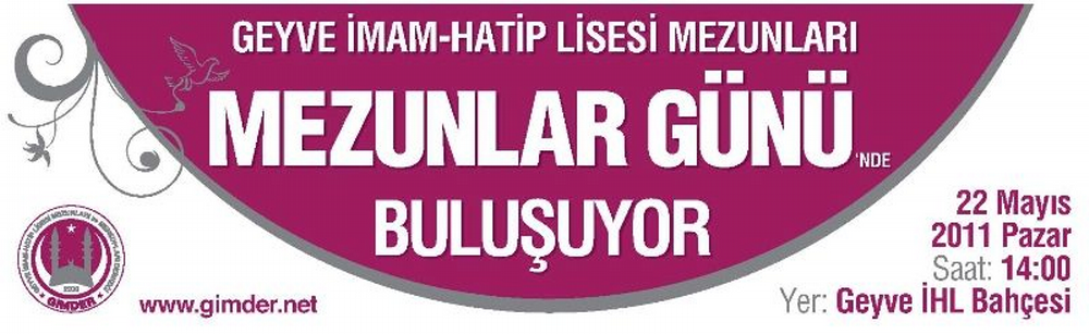 2. Geleneksel Geyve İmam Hatip Lisesi Mezunlar Günü, 22 Mayıs Pazar günü saat 14.00 de Geyve İmam Hatip Lisesi bahçesinde gerçekleşecek. GİMDER ' den yapılan açıklamada; Okulumuzun son mezunlar günü olması nedeniyle bu sene ki mezunlar günümüzü daha önemli hale getirmektedir.
