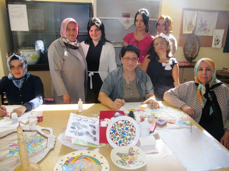 Kurs öğretmeni Zeynep Kuru: “ Kursiyerlere; çeyiz sandığı, ekmeklik, sebzelik, simitçi tepsisi gibi ahşap objeler üzerine vanstrok tekniği çalışmalar, seramik tabak üzerine ve kumaş üzerine gölgeli boyamalar yapmasını öğretiyoruz. “ dedi.