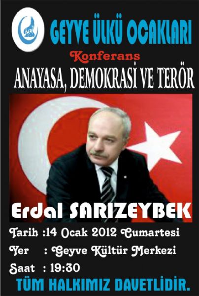 c Geyve Kültür Merkezinde 14 Ocak Cumartesi günü saat 19.30 da Erdal Zeybek, Anayasa, Demokrasi ve terör konulu konferans verecek. Tüm Geyveliler davet edildi.