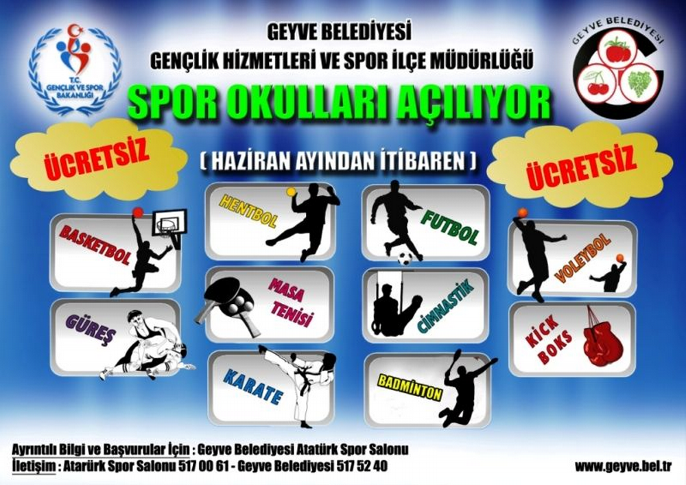HAZİRAN AYINDAN İTİBAREN ÜCRETSİZ SPOR OKULLARIMIZA KAYIT YAPTIRMAK İSTEYEN VATANDAŞLARIMIZIN GEYVE BELEDİYESİ ATATÜRK KAPALI SPOR SALONUNA MÜRACAAT ETMELERİ GEREKMEKTEDİR.